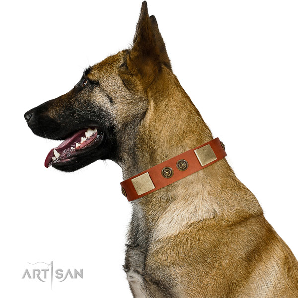 Brass plated buckle will stand out even the strongest dog power. Exquisite embellishments are brass plated and have impressive shining. Underline your Belgian Malinois's individuality, purchase this